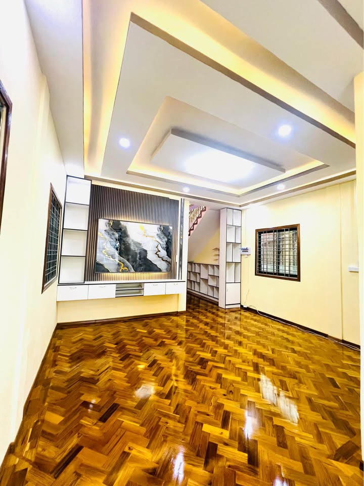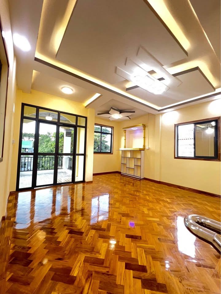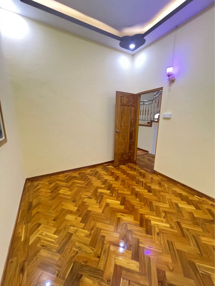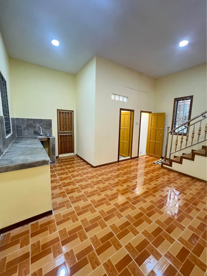 အောက်ထပ် - ဧည့်ခန်းကျယ်/Single Bedroom (1) ခန်း နံရံကပ် show kitchen အလှ အိမ်သာဘိုထိုင် ရေချိုးခန်း မီးဖိုခန်း ပါ